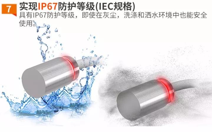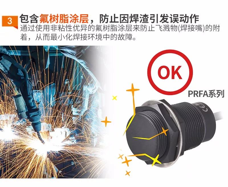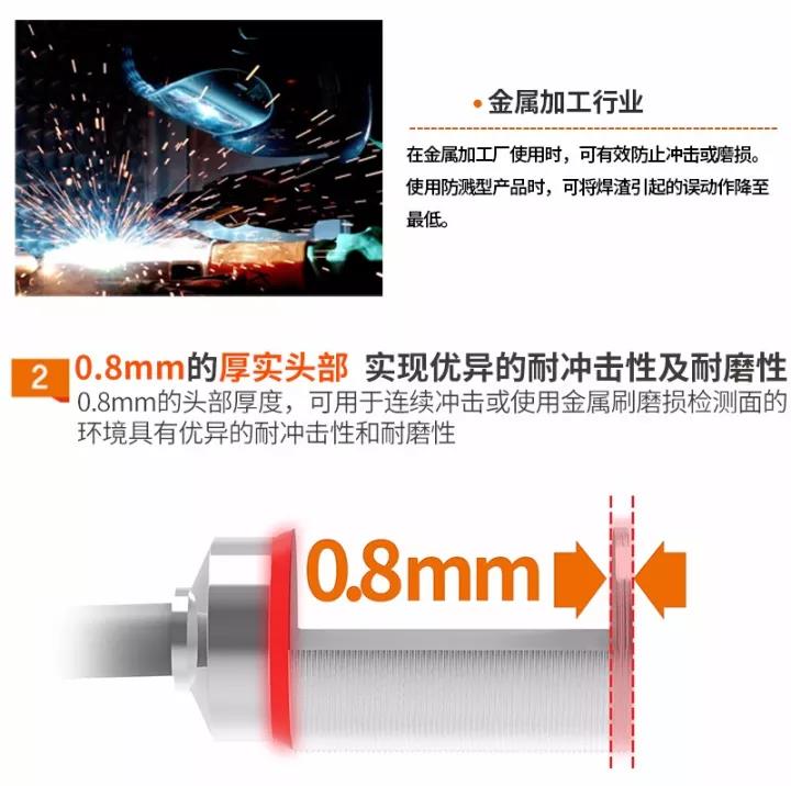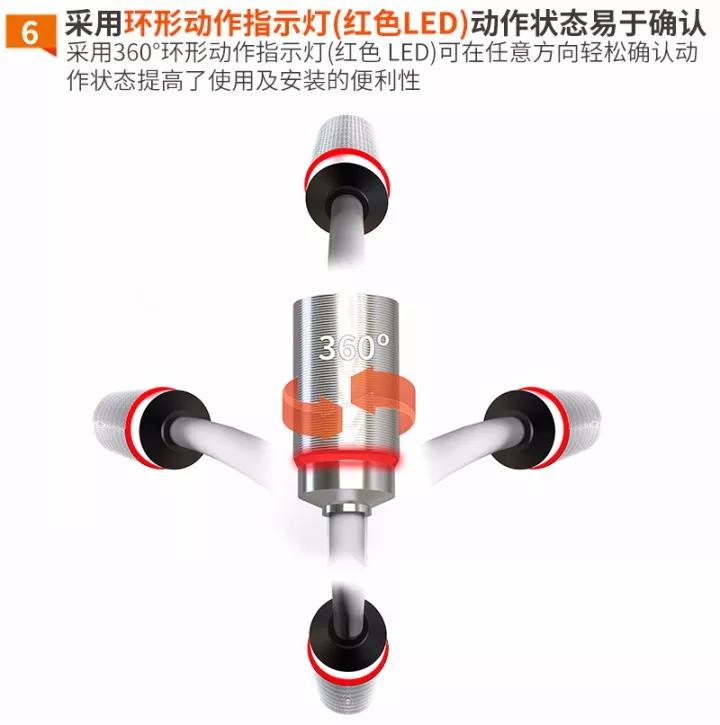 PRF系列圆柱形配线引出型接近开关采用不锈钢303制成的全金属外壳及传感器头部,坚固耐用,具有很强的耐磨损和耐腐蚀能力,可用于各种环境,包括食品和饮料制造,化学和金属加工等行业。 0.8mm厚度的金属开关头部提供了较高的耐冲击和耐磨损性能,360°环型动作指示灯可以让用户从各个角度快速识别动作状态。